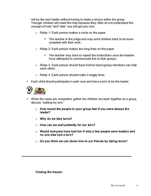 The lesson “Manners: Waiting My Turn” teaches children the importance of good manners, specifically patience and waiting. Children take turns leading the group and are asked to express how it feels to wait and take turns. The lesson includes guided instructions for the teacher, including preparation, a script, and suggested activities to facilitate further learning in a fun and interactive manner. This lesson is designed for children between 3-5 years, and is the tenth lesson in the 1st Year Core Curriculum Set and part of the “Social Relationships” unit.