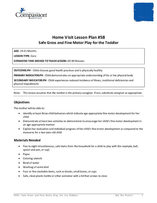 The lesson “Safe Gross and Fine Motor Play for the Toddler” helps the mother/caregiver identify at least three child behaviors that indicate age-appropriate fine motor development. She is then equipped to demonstrate at least two activities that encourage her child’s fine motor development in an age-appropriate manner. This lesson teaches her to track and evaluate her child’s progress in fine motor development as compared to the measures for a two-year-old child.