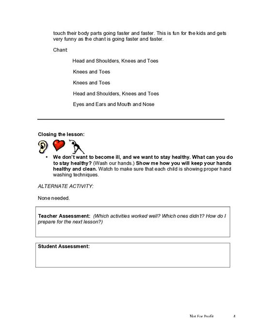 The lesson “I Can Wash My Hands to Stay Healthy” is part 32 of a 42 part series on parts of the human body, health, and safety. This lesson focuses on hand washing to reduce germs and illness. This resource includes a lesson plan for the teacher on how to prepare beforehand, class-time content to facilitate learning, hands-on activities facilitating further learning, and a teacher assessment at the end. This lesson is designed for a group of young children between the ages of 3 and 5, and is the thirty-second physical development lesson in the Core Curriculum, 3-5 years, Year One.